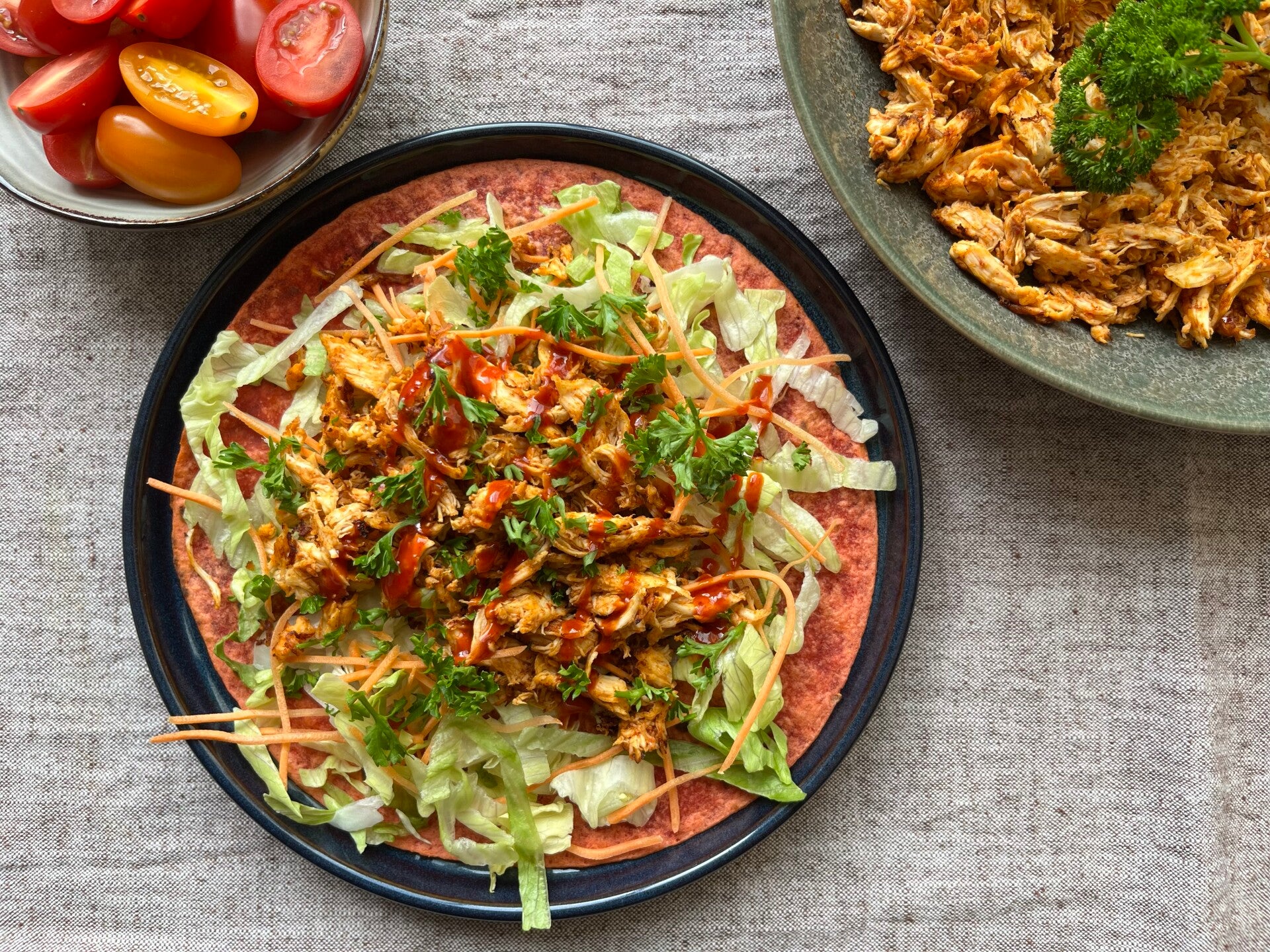 Stap 6: Voor de saus meng je alle ingrediënten. Leg de kip in de schuitjes van de romaine sla en verdeel de honing, bosui en sesam erover.  Serveer met de sriracha saus en de groene salade. Eet smakelijk!